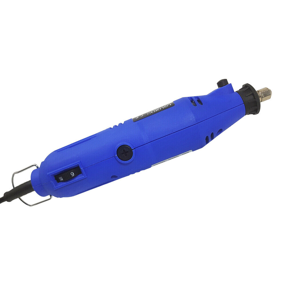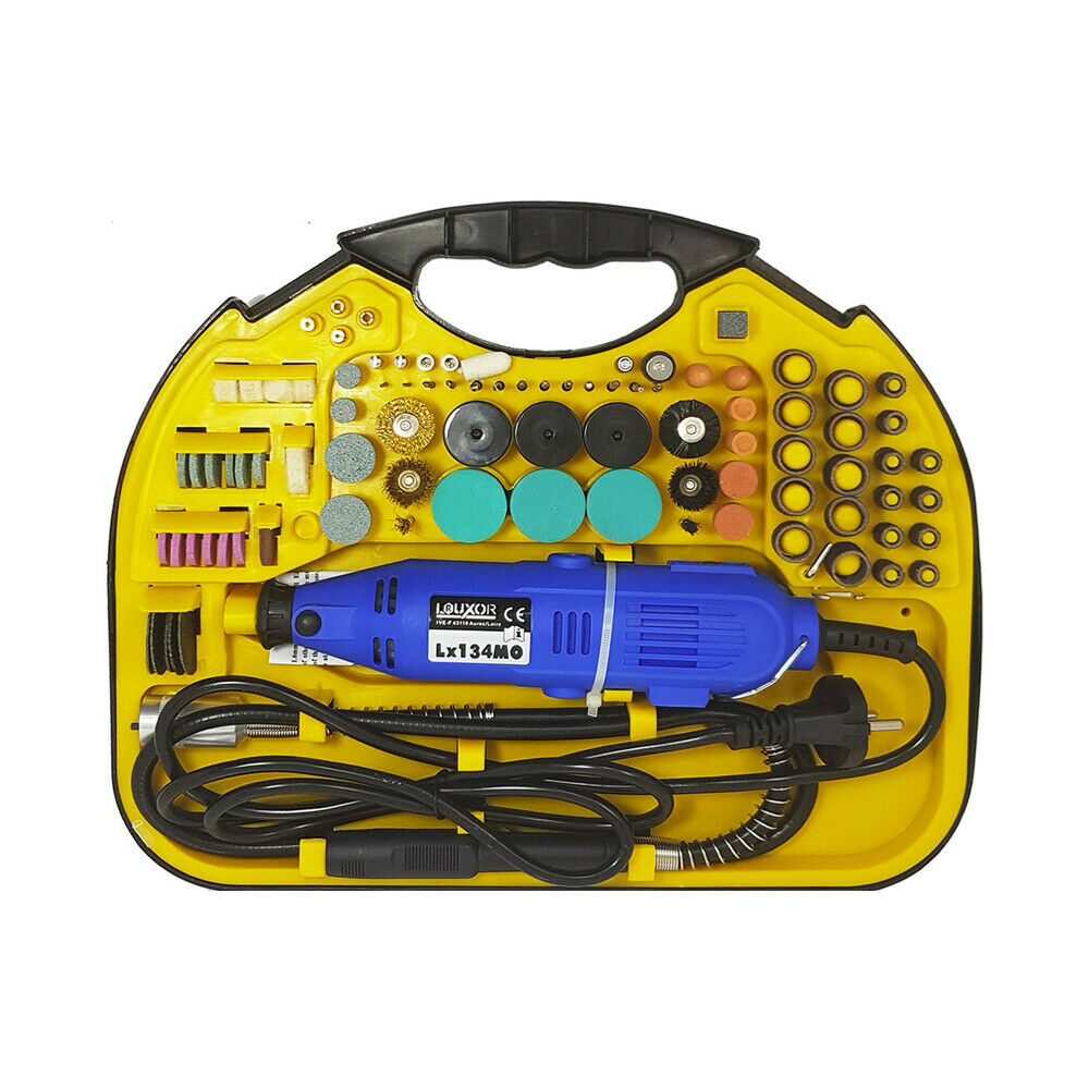 Mini utensile rotativo con albero flessibile completo di un'ampia gamma di accessori per levigare, tagliare, lucidare, incidere, forare, ecc. Operando con l'albero flessibile, il quale dispone alla fine di un mandrino di precisione, si aumenta notevolmente la precisione di utilizzo. Il tutto contenuto in una pratica valigetta.