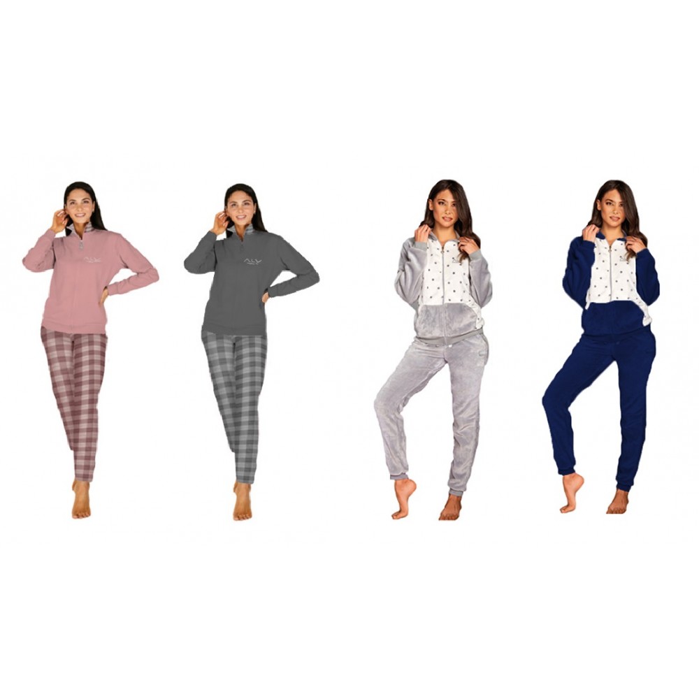 - Pigiama lungo da donna in Pile, composto da: maglia con full zip posta sul fronte, fantasia sul fronte, bordo finale; pantaloni in coordinato con tasche laterali.