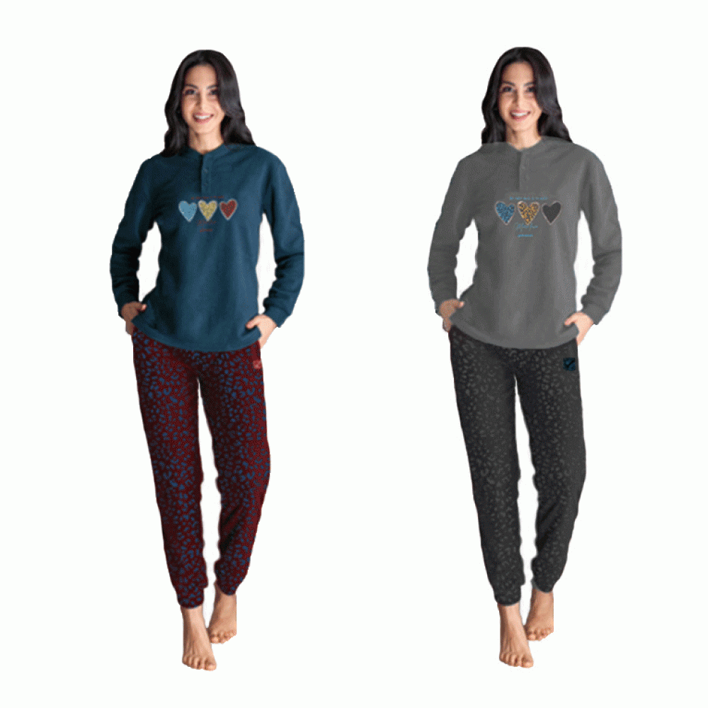 • Pigiama Invernale lungo da donna in Pile, composto da: maglietta girocollo, bottoncini sullo scollo, stampa disegno sul fronte, bordo finale; pantaloni in coordinato o in contrasto colore, pantaloni con tasche laterali.