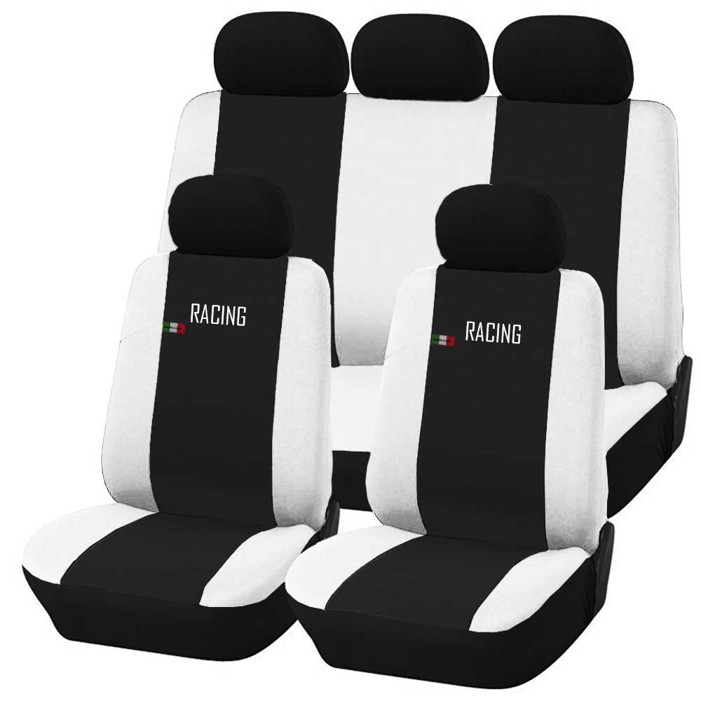 Coprisedili universali 12pz in tessuto acrilico accoppiato nero al centro, ai lati tessuto cotone colorato e parte posterione in maglina adattabili a tutte le auto con sedili standard.