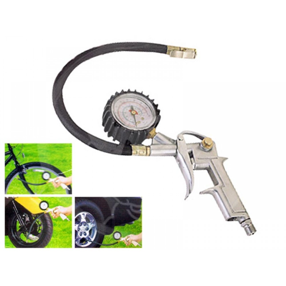Pistola per gonfiaggio ruote auto, bici, moto. Manometro professionale (BAR/kPa) con diametro interno pari a 55mm e protezione antiurto in gomma.