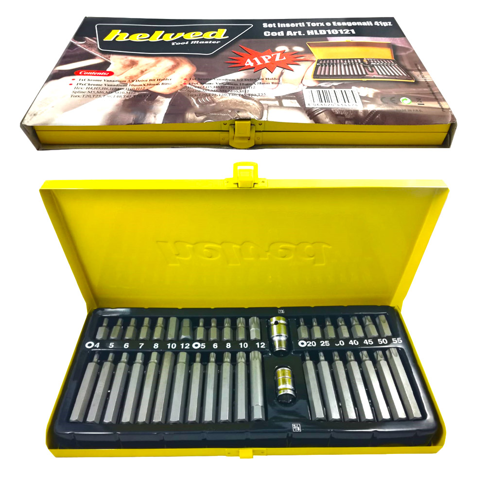 Kit Inserti Torx, Esagonali E Millerighe + 2 Adattatori 41 Pz. Cromo Vanadio Helved Hld10121
