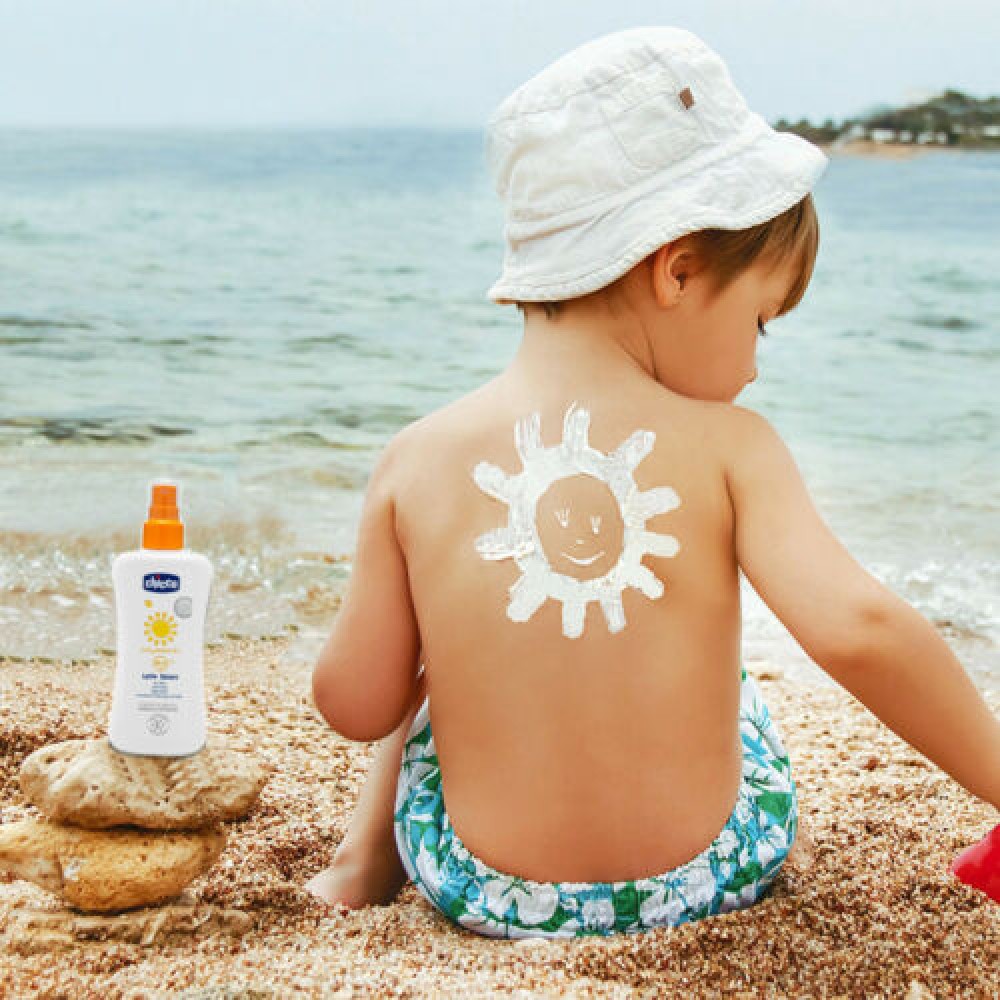 Il Latte solare 25 SPF Chicco, con protezione media, nutre la pelle, proteggendola dai raggi solari (UVA e UVB). Senza profumo, alcool, coloranti.