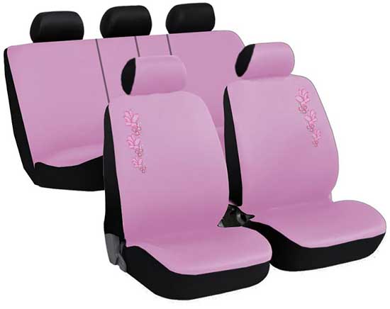 Coprisedili in cotone e poliestere con fiore ricamato con zip nella parte posteriore che permettono di essere montati su quasi tutte le auto e in quasi tutte le versioni dei sedili posteriori.