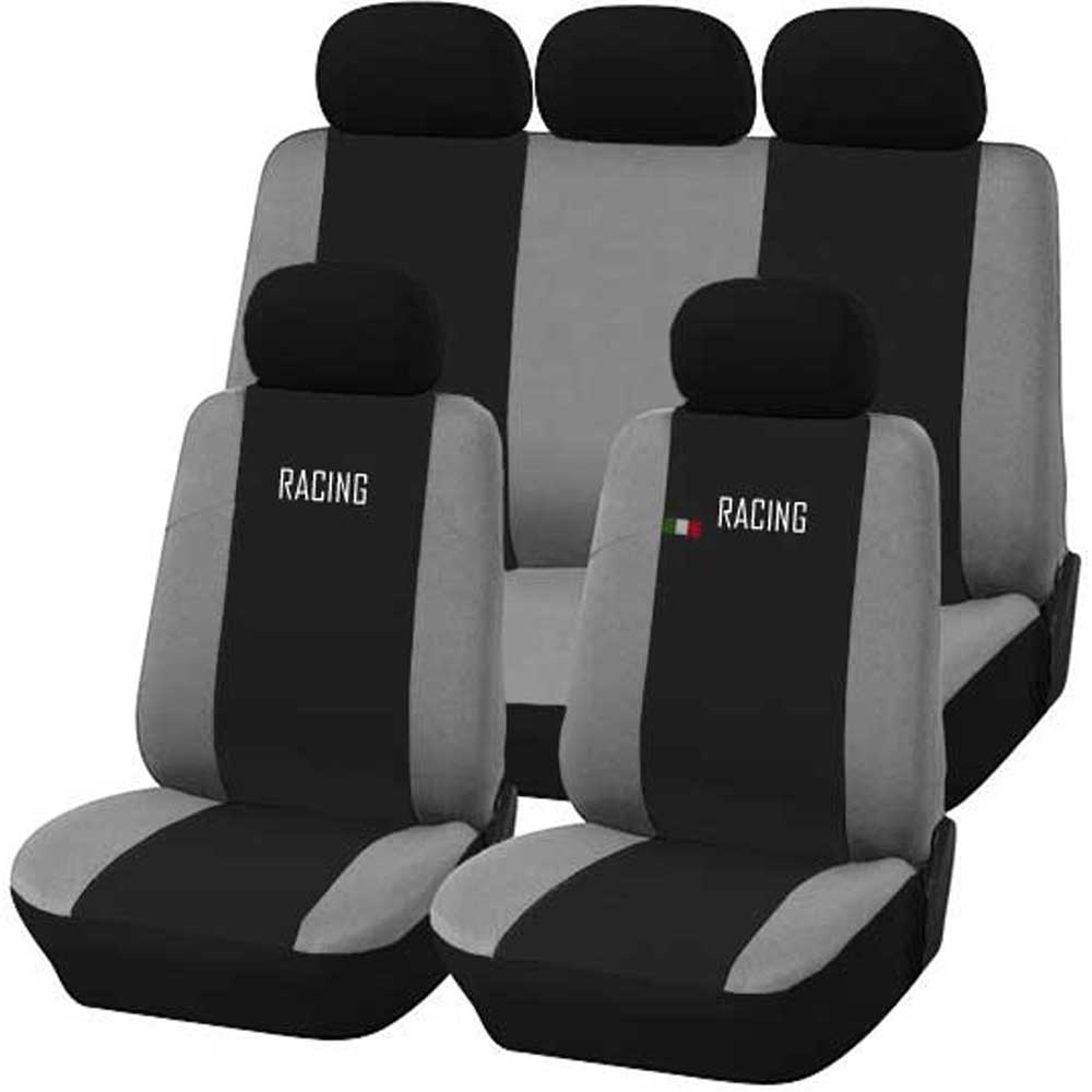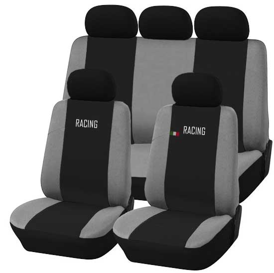 Coprisedili universali in tessuto acrilico accoppiato nero al centro, ai lati tessuto cotone colorato e parte posterione in maglina adattabili a tutte le auto con sedili standard.