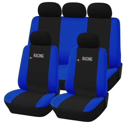 Coprisedili universali 12pz in tessuto acrilico accoppiato nero al centro, ai lati tessuto cotone colorato e parte posterione in maglina adattabili a tutte le auto con sedili standard.