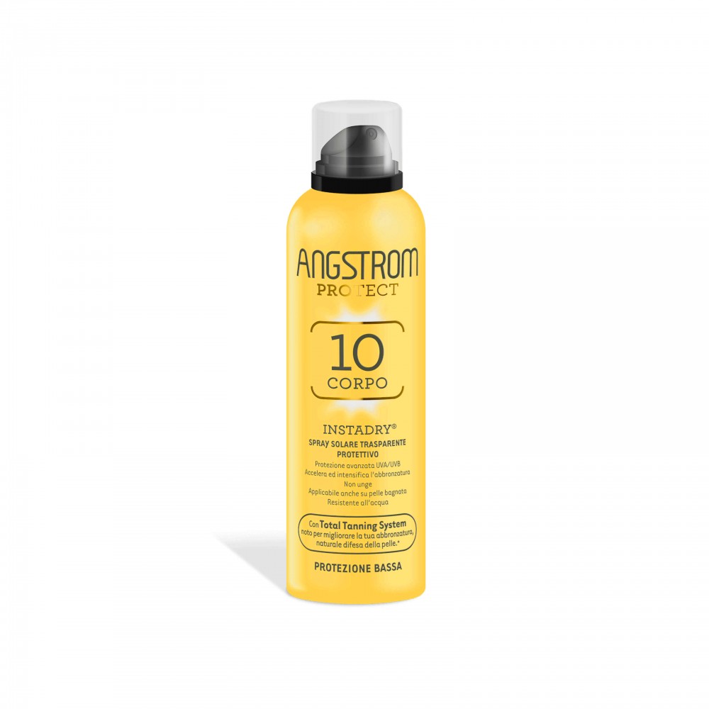 ANGSTROM INSTANDRY, è l'innovativo spray trasparente nebulizzato ideale per chi vuole uno spray leggero, facile da applicare perfino sulla pelle ancora bagnata. Massima praticità d'uso e comfort per tutti coloro che non amano le tradizionali creme solari. La sua formula resistente all'acqua e che non unge lo rende ideale per chi ama praticare sport estivi. Contiene filtri solari UVA\UVB avanzati, fotostabili, ad ampio spettro per un'immediata protezione dai raggi solari nocivi. Formula idratante trasparente si applica immediatamente, anche sulla pelle bagnata senza lasciare traccia per una sensazione di pelle asciutta al tatto. Questa formula ultra leggera può essere spruzzata da tutte le angolazioni per una facile applicazione. La sua formulazione è arricchita con Total Tanning System noto per migliorare e prolungare la naturale abbronzatura stimolando la produzione di melanina ed aumentando cosi le naturali difese della pelle dal sole. Leggermente profumato. Dermatologicamente testato .