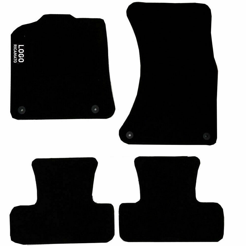 Tappetini auto in moquette compatibili con Audi Q5 anteriori e posteriori sagomati con logo ricamato e battitacco sul lato guida. Moquette nera di alta qualità inodore e con Bordatura in tessuto che evidenzia la forma e lo rende sportivo ed elegante. Clip di fissaggio originali gia' applicati al tappeto (posizionati come da foto).