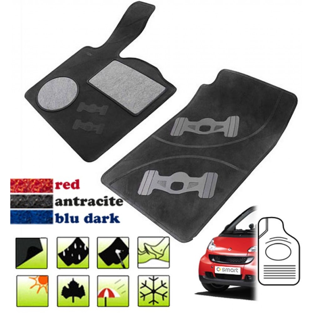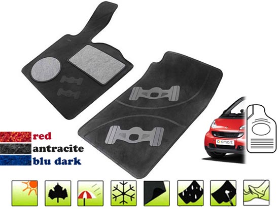 Tappetini per smart in moquette e gomma, mobido e antiscivolo. Il prodotto impermeabile e lavabile.