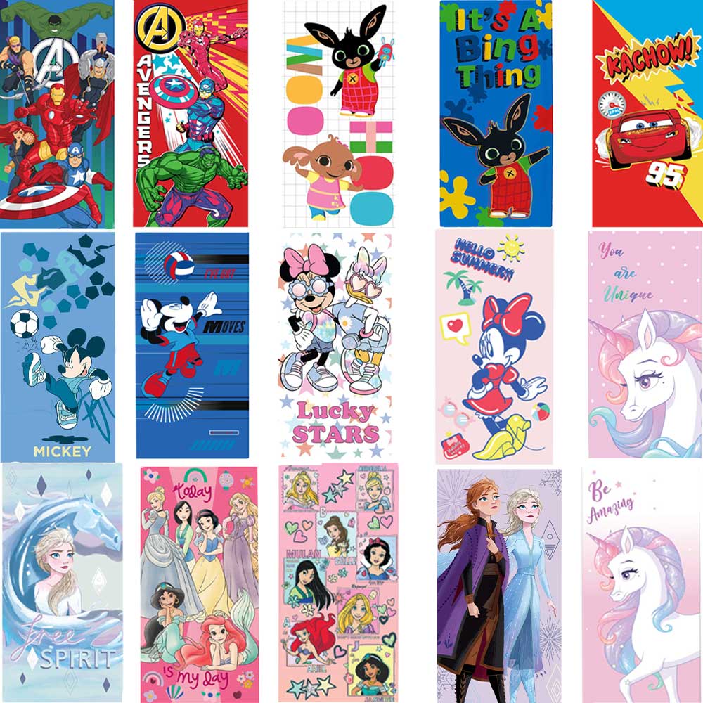 Asciugamani in microspugna adatto ai bambini in varie fantasie. Adatti al mare, alla piscina o al bagno di casa che raffigurano i cartoni più amati dai piccoli come Bing, Disney, Frozen.