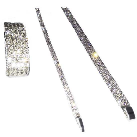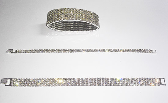 3 Bracciali in metallo colore argento o dorato (rame nikel e strass in vetro taglio swarovski) con chiusura a scatto.