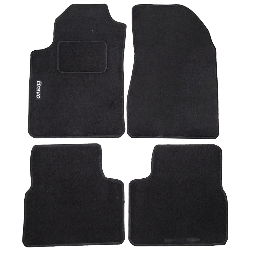 Set tappeti auto su misura in moquette con battitacco in plastica, anteriori e posteriori, con logo ricamato sul tappetino anteriore lato guida. Moquette nera di alta qualità inodore.